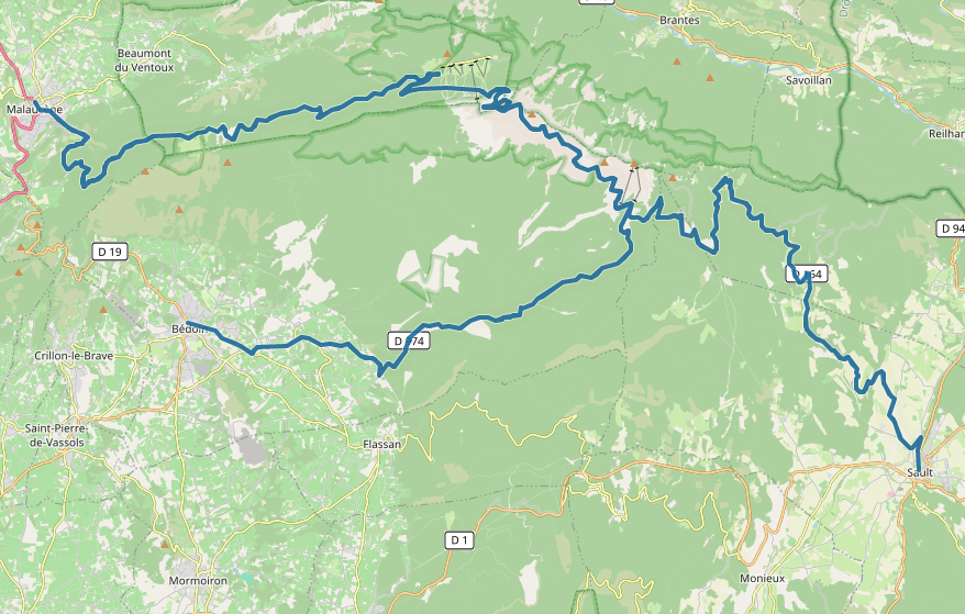 For those finding the ascent of Mont Ventoux too challenging, Track 1 offers a scenic alternative: riding from Sault through the equally stunning Nesque Valley. This route takes us past the cave Bau de l’Aubesier, the oldest known site of early Neanderthals in France, adding a touch of historical intrigue to our journey.